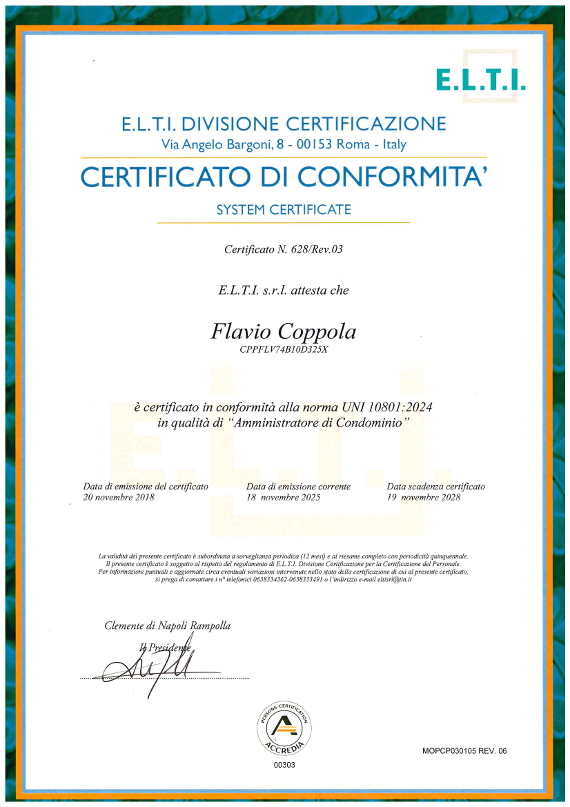 In data 18 Novembre 2025 il dottor Flavio Coppola è certificato in conformità alla norma UNI 10801:2024 in qualità di "Amministratore di Condominio"